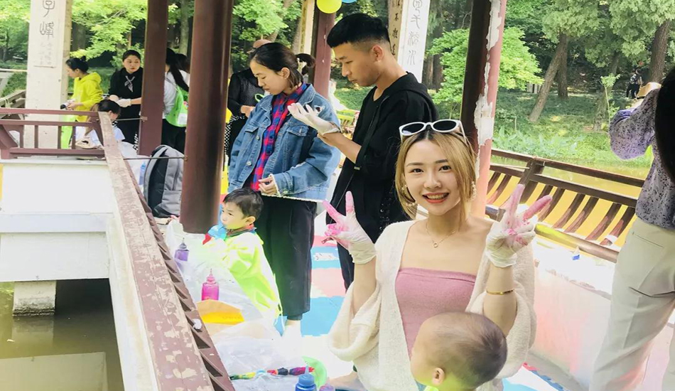 扎染是中国民间传统而独特的染色工艺,让宝贝们感受我国民间艺术的风采,感受扎染的图案美、色彩美和形式美,用了多种不同的形式对手绢进行扎染的方法,促进了粑粑麻麻和宝贝之间的亲子互动。